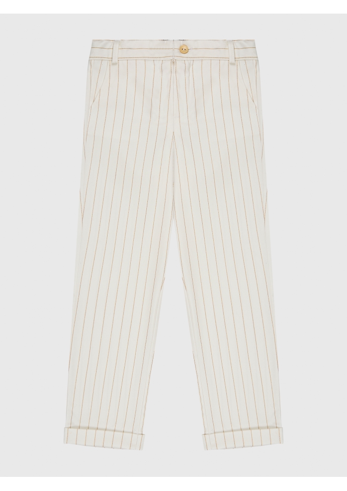 Брюки классические для мальчика белые с золотой полоской с регулировкой объема талии. Одно из главных преимуществ брюк - универсальность, данная модель идеальна для повседневных будней и праздников. В состав входит натуральная вискоза, что позволяет ткани пропускать воздух, а коже ребенка дышать. Материал достаточно плотный, чтобы сохранять цвет и форму после многочисленных стирок. Внутренняя резинка на пуговках брюк обеспечивает отличную посадку на любой тип фигуры. Так же брюки имеют манжет, что позволяет удлинить изделие.