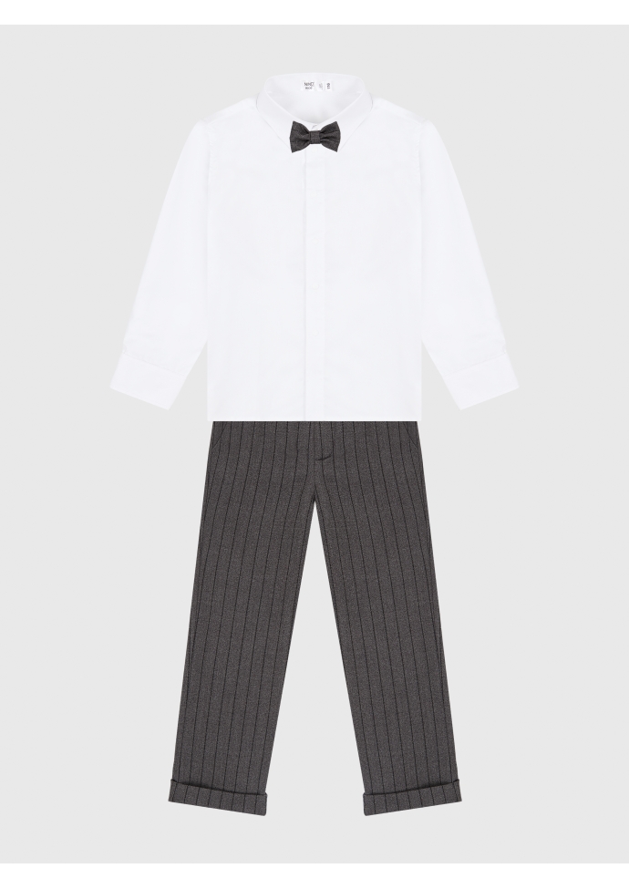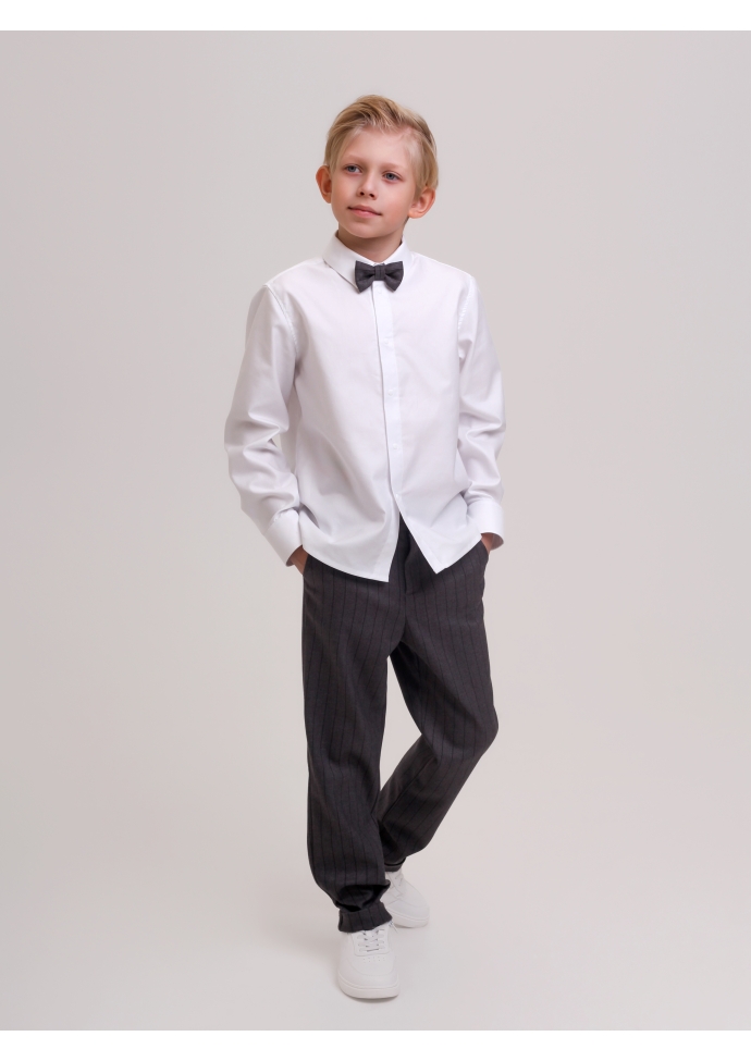 Брюки, бабочка. Брюки классические для мальчика серого цвета в полоску с регулировкой объема талии. Одно из главных преимуществ брюк - универсальность, данная модель идеальна для праздников и повседневных будней. В состав входит натуральная вискоза, что позволяет ткани пропускать воздух, а коже ребенка дышать. Материал достаточно плотный, чтобы сохранять цвет и форму после многочисленных стирок. Внутренняя резинка на пуговках брюк обеспечивает отличную посадку на любой тип фигуры. Так же брюки имеют манжет, что позволяет удлинить изделие.