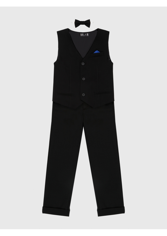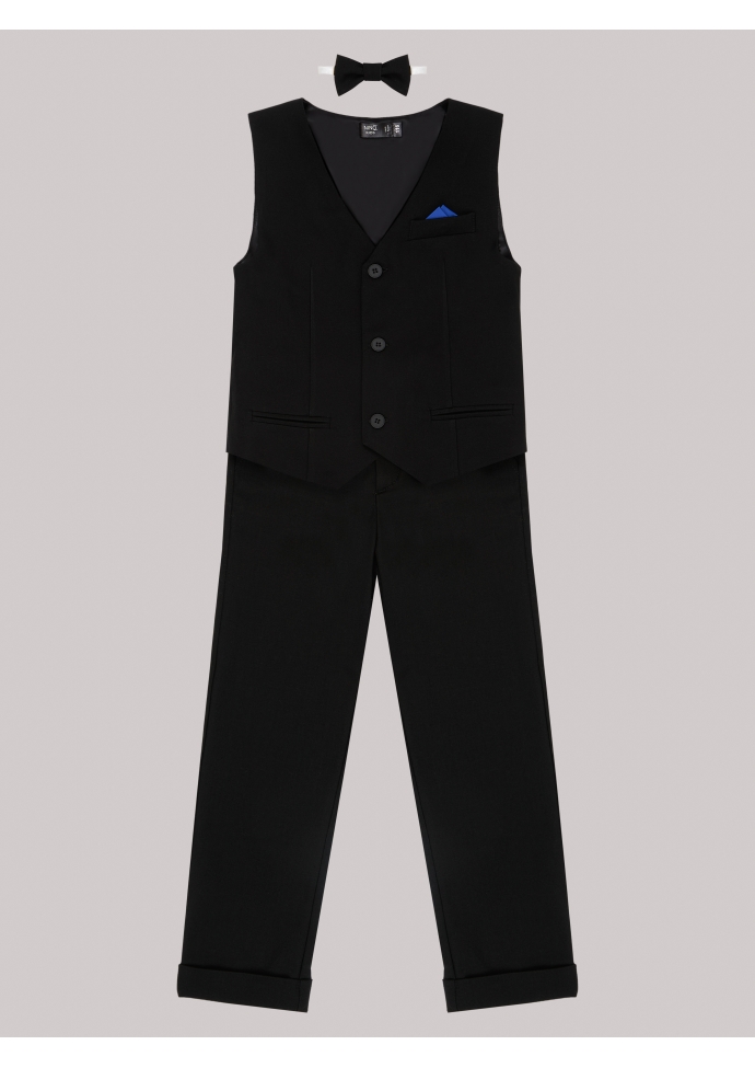 Однобортный жилет, брюки, бабочка. Костюм черного цвета, в комплект которого входят: однобортный жилет, брюки, бабочка. Одно из главных преимуществ этого костюма - его универсальность. Приобретая данную модель, вы не пожалеете, изделие имеет возможность регулироваться в объеме и длине, поэтому даже с учетом роста ребенка, костюм может быть использован достаточно длительный период. В состав ткани входит натуральная вискоза, что позволяет пропускать воздух, а коже ребенка дышать. Материал подклада так же натуральный, поэтому вы можете не беспокоиться за экологичность и безопасность изделия. Ткань костюма достаточно плотная, чтобы сохранять цвет и форму после многочисленных стирок. Жилет регулируется пряжкой, что обеспечивает отличную посадку на любой тип фигуры, внутренняя резинка на пуговках брюк обеспечивает регулировку объема по талии. Так же брюки имеют манжет, что позволяет удлинить изделие.