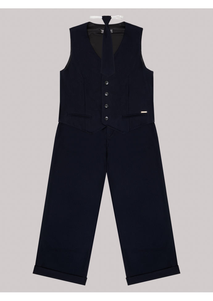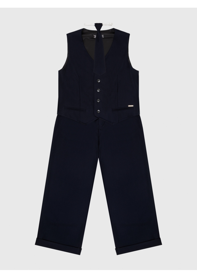 Однобортный жилет, брюки широкие, галстук. Костюм синего цвета, в комплект которого входят: однобортный жилет, брюки, галстук. Одно из главных преимуществ этого костюма - его универсальность. Приобретая данную модель, вы не пожалеете, изделие имеет возможность регулироваться в объеме и длине, поэтому даже с учетом роста ребенка, костюм может быть использован достаточно длительный период. В состав ткани входит натуральная вискоза, что позволяет пропускать воздух, а коже ребенка дышать. Материал подклада так же натуральный, поэтому вы можете не беспокоиться за экологичность и безопасность изделия. Ткань костюма достаточно плотная, чтобы сохранять цвет и форму после многочисленных стирок. Жилет регулируется пряжкой, что обеспечивает отличную посадку на любой тип фигуры, внутренняя резинка на пуговках брюк обеспечивает регулировку объема по талии. Так же брюки имеют манжет, что позволяет удлинить изделие.